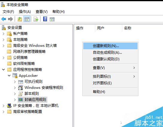 依次展开应用程序限制策略-APPLocker-封装应用规则-在右侧空白处选择创建新规则;