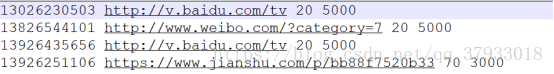 例如:"18611132889 http://v.baidu.com/tv 20 5000"是一条上网行为,第一个字段代表手机号码,第二个字段代表请求网站的URL,第三个字段代表请求发送的数据即上行流量(20字节),第四个字段代表服务器响应给用户的流量即下行流量(5000字节)。