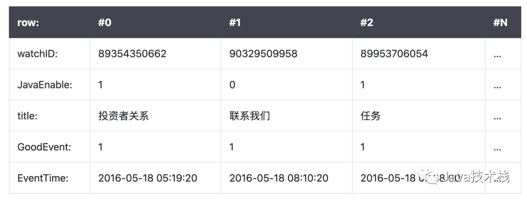 在列式数据库系统中(ClickHouse),数据按如下的顺序存储: