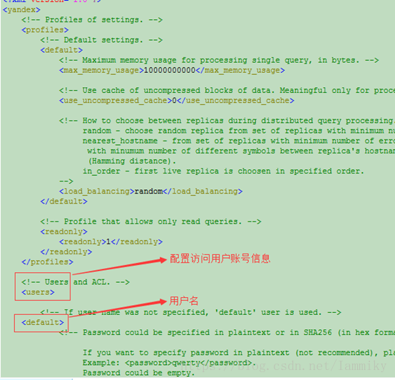 clickHouse的数据库用户名和密码采用配置文件的方式配置,并非像传统的数据库那样可以通过数据库设置,因此,首先要为数据库指定一个特定的用户,及访问权限。clickHouse默认使用default用户,对其下面的数据库拥有访问和增删改查的权限,这显然不符合开发要求,对用户极大的不负责任。下面是指定特定用户访问权限代码: