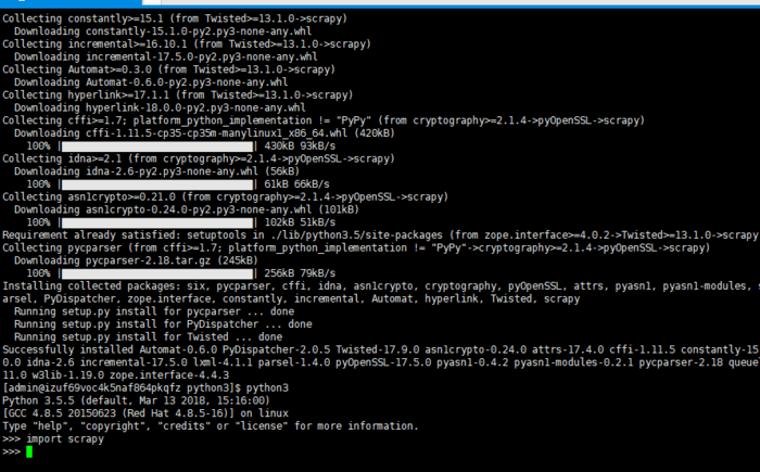[root@hadron ~]# pip3 install scrapy Collecting scrapy Downloading Scrapy-1.5.0-py2.py3-none-any.whl (251kB) 100% |████████████████████████████████| 256kB 1.1MB/s Requirement already satisfied: lxml in /usr/local/python3/lib/python3.5/site-packages (from scrapy) Collecting PyDispatcher>=2.0.5 (from scrapy) Downloading PyDispatcher-2.0.5.tar.gz .... .... Collecting pycparser (from cffi>=1.7; platform_python_implementation != "PyPy"->cryptography>=2.1.4->pyOpenSSL->scrapy) Downloading pycparser-2.18.tar.gz (245kB) 100% |████████████████████████████████| 256kB 339kB/s Installing collected packages: PyDispatcher, zope.interface, constantly, incremental, six, attrs, Automat, hyperlink, Twisted, cssselect, w3lib, parsel, asn1crypto, pycparser, cffi, cryptography, pyOpenSSL, pyasn1, pyasn1-modules, service-identity, queuelib, scrapy Running setup.py install for PyDispatcher ... done Running setup.py install for Twisted ... done Running setup.py install for pycparser ... done Successfully installed Automat-0.6.0 PyDispatcher-2.0.5 Twisted-17.9.0 asn1crypto-0.24.0 attrs-17.4.0 cffi-1.11.4 constantly-15.1.0 cryptography-2.1.4 cssselect-1.0.3 hyperlink-18.0.0 incremental-17.5.0 parsel-1.4.0 pyOpenSSL-17.5.0 pyasn1-0.4.2 pyasn1-modules-0.2.1 pycparser-2.18 queuelib-1.4.2 scrapy-1.5.0 service-identity-17.0.0 six-1.11.0 w3lib-1.19.0 zope.interface-4.4.3 [root@hadron ~]#