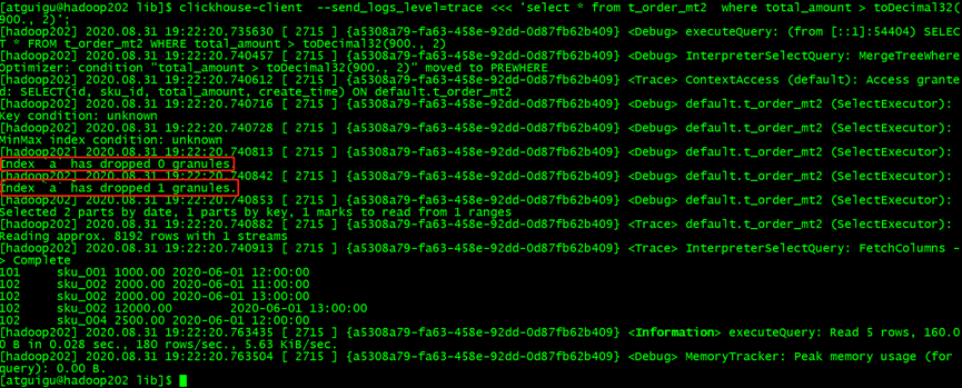 [root@hadoop102 lib]$ clickhouse-client --send_logs_level=trace <<< 'select * from t_order_mt2 where total_amount > toDecimal32(900., 2)';
