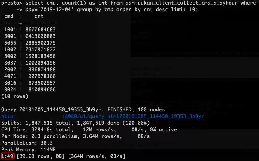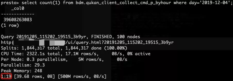 从上图可以看到clickhouse在count一个1100亿数据表只需要2s不到的时间, 由于数据冗余存储的关系,clickhouse实际响应该次查询的机器数只有30台(60 / 2),presto在count一个400亿的数据表耗时80秒左右的时候,100台机器同时在处理这个count的查询。