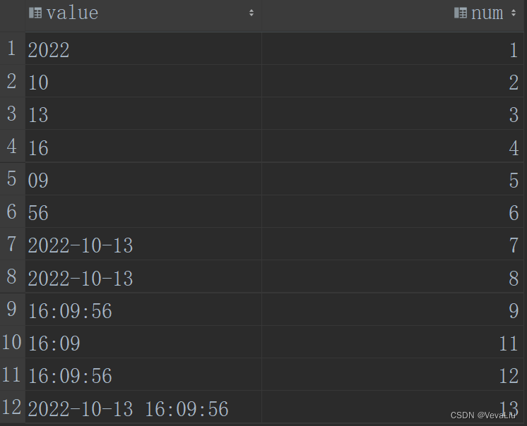 select formatDateTime(now(),'%H:%M:%S') vlaue,9 num
