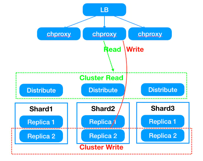 总体上讲,一句话总结:业务访问统一入口,读分布式表,写本地表。