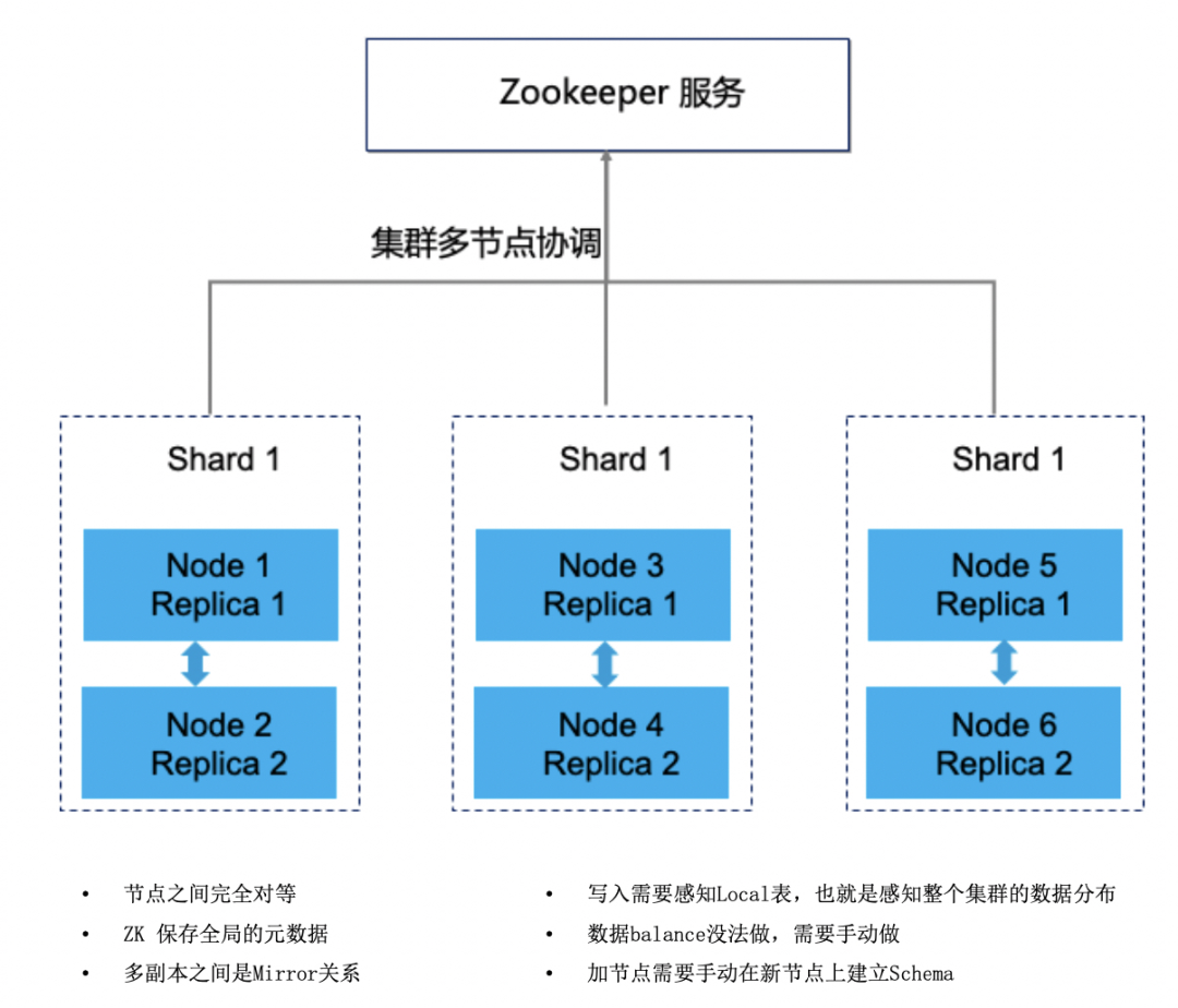 副本同步使用底层ReplicatedMergeTree引擎,提升副本同步性能以及数据一致性(需要手动创建底层表,保证主备关系正确);