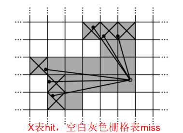 在扫描过程中,被激光击中(hit)的栅格我们将其加入到hit set中,对于一束激光中未命中的栅格我们将其加入到miss set中。如果这些栅格没有被观测过,会被分配一个概率
