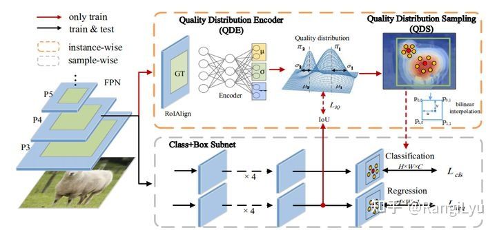 LAD就是使用教师网络预测的结果去计算标签匹配,来指导学生网络训练。但是,KD存在的问题就是需要额外再训练一个教师模型,这就导致训练所需要的资源大大增加!那么有没有一个即插即用的小插件能够做这件事呢?其实,旷视在 CVPR 2021提出的IQDet,就使用了一个小模块,去对每个实例预测PAA中提出的高斯混合质量分布的三个参数来指导检测头的训练。但由于QDE需要先对Feature Map做ROI Align,也显得有一些复杂了。