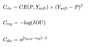 使用AGM预测的分类概率和检测框会送入DSLA模块计算Matching Cost。Cost函数由三部分组成:classification cost,regression cost以及distance cost: