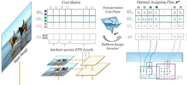 在这之前先简单介绍一下什么是基于Matching Cost的动态匹配:简单来说,就是直接使用模型检测头的输出,与每一个Ground Truth计算一个匹配的代价,这个代价一般由分类loss和回归loss组成。Feature Map上所有的点(N个)的预测值与所有的Ground Truth(M个)计算得到的NxM的矩阵,就是所谓的Cost Matrix,基于这个Cost Matrix进行二分图匹配也好还是传输优化也好再或者直接取TopK也好,就是一种动态匹配策略。这种策略与之前的基于Anchor算IOU的匹配最大的不同就是,它不再只依赖先验的静态的信息,而是使用当前的预测结果去动态寻找最优的匹配,只要模型预测的越准确,匹配算法求得的结果也会更优秀。