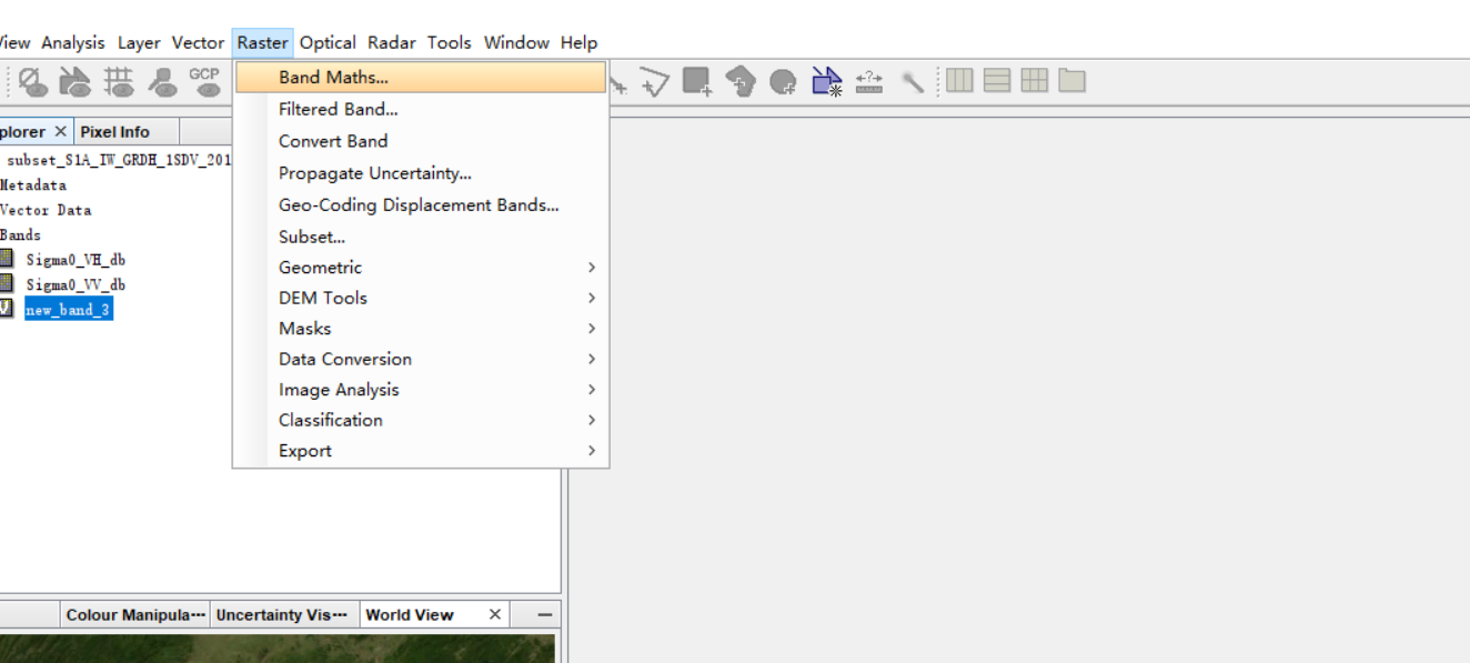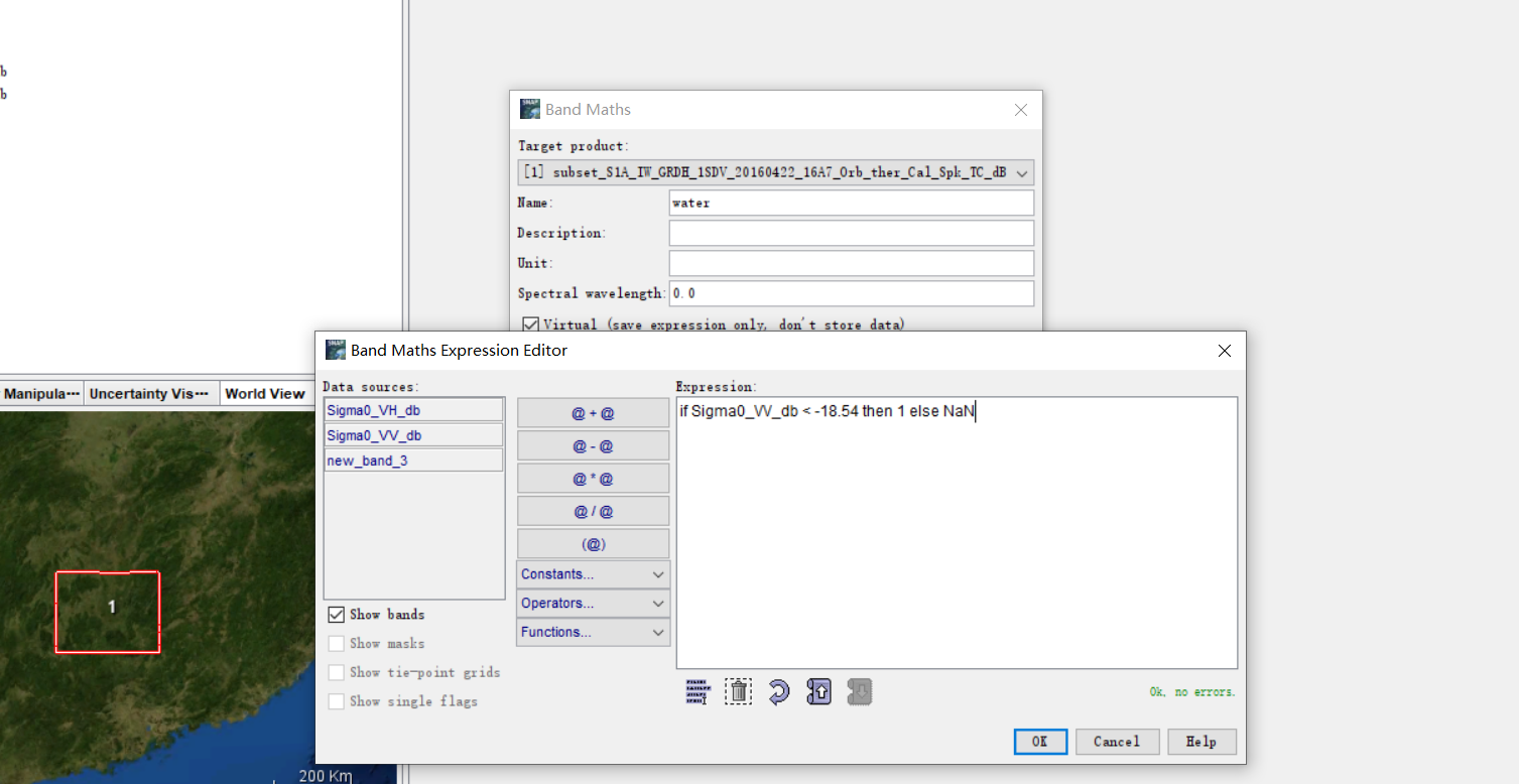 利用直方图确定阈值(用SNAP直接生成或者利用envi选取样本ROI确定阈值)之后,利用SNAP软件band math 提取水体,