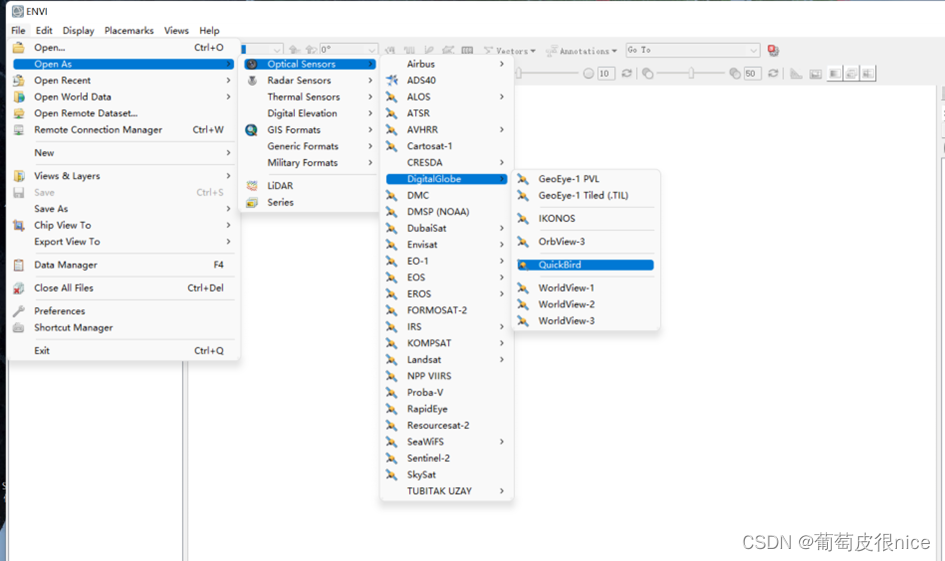 1.在 ENVI 5.3中选择菜单 File > Open As > QuickBird,在弹出的对话框中选择文件“...数据QuickBird008.TIL”。 打开 Data Manager,可以看到 ENVI 自动识别 QB 数据的 RPC 信息。