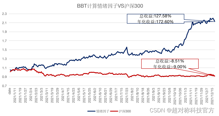 超对称团队应用BBT模型计算个股的情绪指数,再监测相邻时段的情绪变化,选取突出变化作为多空因子构建量化因子策略,最终收益远超市场。超对称团队回溯情绪指数杰出的选股能力,发现模型能有效地学习金融财经类文本,并量化地反映市场的信息,创造性地提供另类因子。除了计算市场情绪,BBT模型拥有的多维度能力也同样可以运用在财经金融领域。例如利用BBT的事件抽取能力,可以抽取出同类事件或新闻与量价数据做对照,以研究不同事件传导到市场速度的快慢;BBT还可以通过超对称团队独有的金融知识图谱学习供应链中经济个体间的相互关系,以机器学习的方法来消除因子间的共线性,为传统线性回归多因子模型为传统线性回归多因子模型带来颠覆性创新;除此之外,BBT的负面消息识别能力还可以为信用风险评估体系增加实时舆情监控,新闻分类能力更是能帮助财务分析师和金融分析师快速处理大量信息,以获得更全面客观的结论。