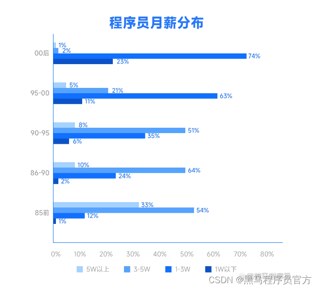 另外,拥有工作经验越多,薪资也相应变高。报告数据显示,在同一薪资分布区间内,年龄越大,在高收入区间内的占比越高,比如在月薪5w+的程序员中,85前出生的程序员占比高达33%,而00后程序员占比仅1%。月薪3-5w之间的程序员中,也是86-90年出生和85前出生的程序员占比较大,分别是64%和54%。