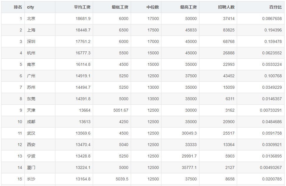 接下来我们以城市为维度,了解各个城市程序员的工资情况。