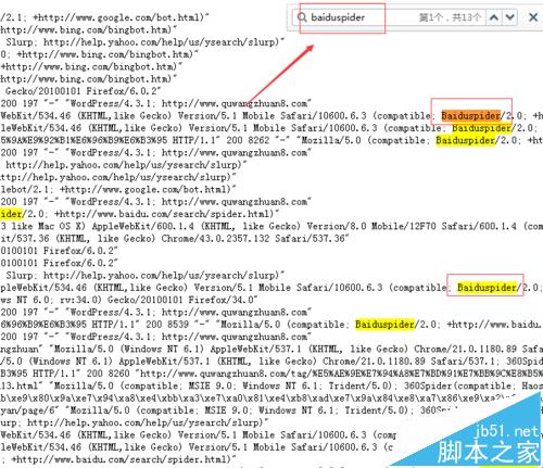 2、按住“ctrl+F”搜索“baiduspider"爬行记录。