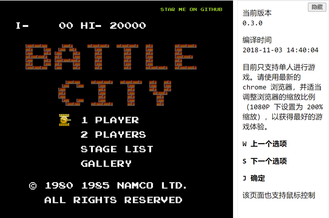 基于 React 的经典坦克大战,这个 GitHub 仓库的版本是经典坦克大战的复刻版本,基于原版素材,使用 React 将各类素材封装为对应的组件。素材使用 SVG 进行渲染以展现游戏的像素风,可以先调整浏览器缩放再进行游戏,1080P 屏幕下使用 200% 缩放为最佳。