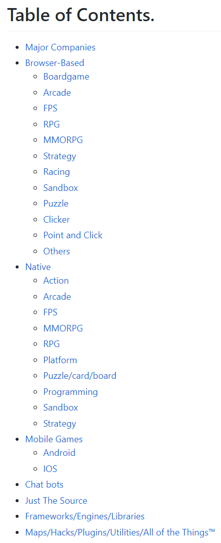 这个开源项目作者收集了托管在 GitHub 上的开源游戏以及跟游戏相关的项目列表,所含的项目类型众多,游戏种类包括教育类、浏览器类等,还包括一些开源的游戏引擎等等。