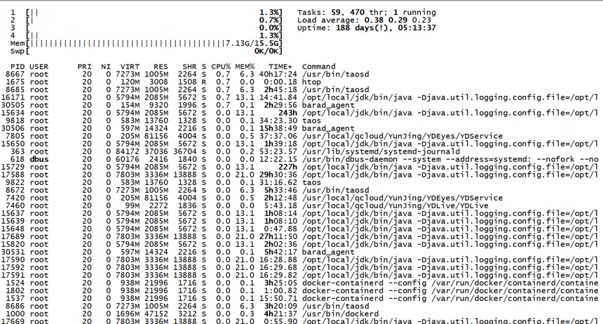 这个是使用TDengine后服务器的资源使用情况,服务器上还允许了好几个Java应用程序,一点压力没有,内存,CPU等都没有压力。