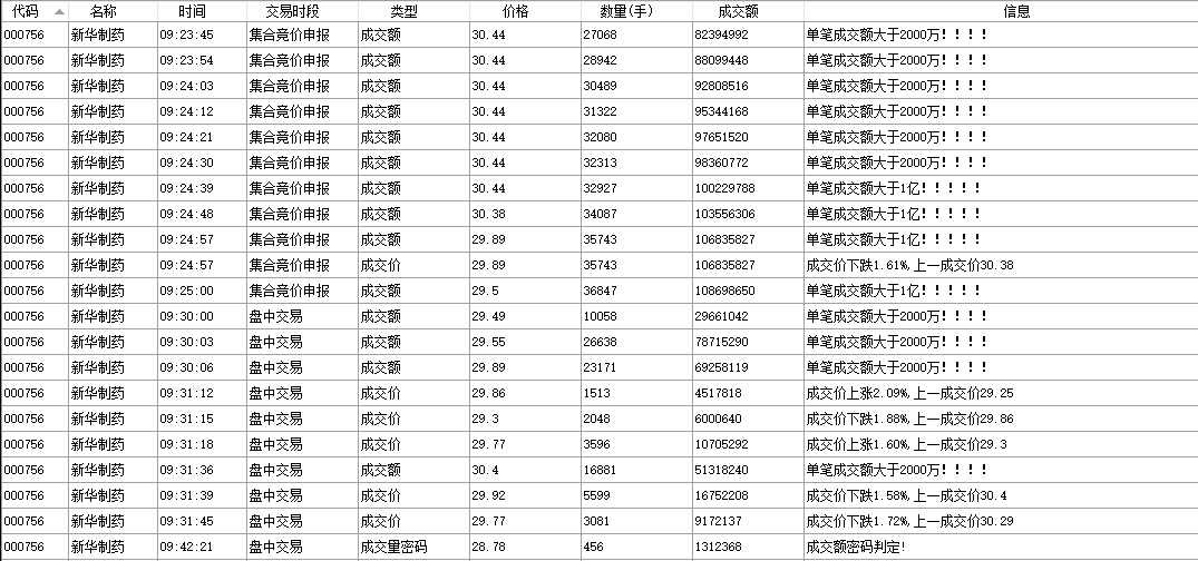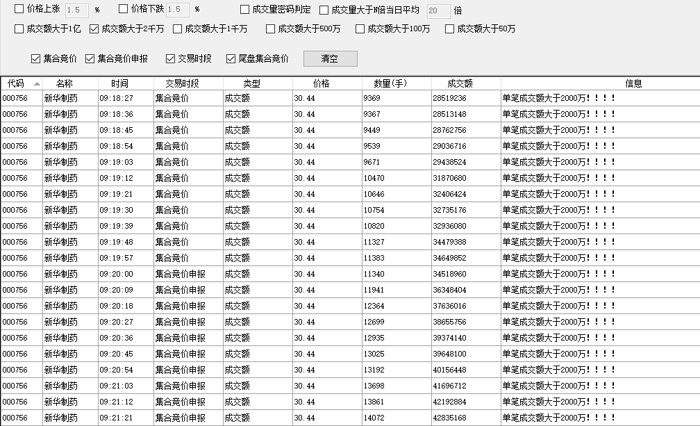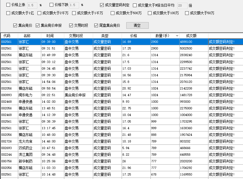 3.将步骤2中匹配到的结果显示到软件界面右侧的表格中,包含股票代码、名称、成交时间、判断类型、成交价格、成交手数、成交额、提示信息等,可通过表格列头对数据进行排序;同时可通过右键菜单将表格的数据保存为Excel;