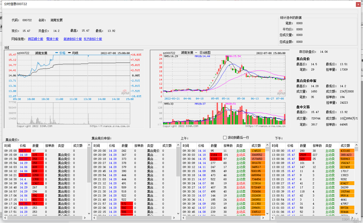 主要功能为:5秒刷新显示一次新浪获取到的分时图和K线图;按照集合竞价、集合竞价申报、上午、下午各个时段分别显示分时数据;统计各阶段的成交信息和最大最小值;计算选中分时数据统计信息。
