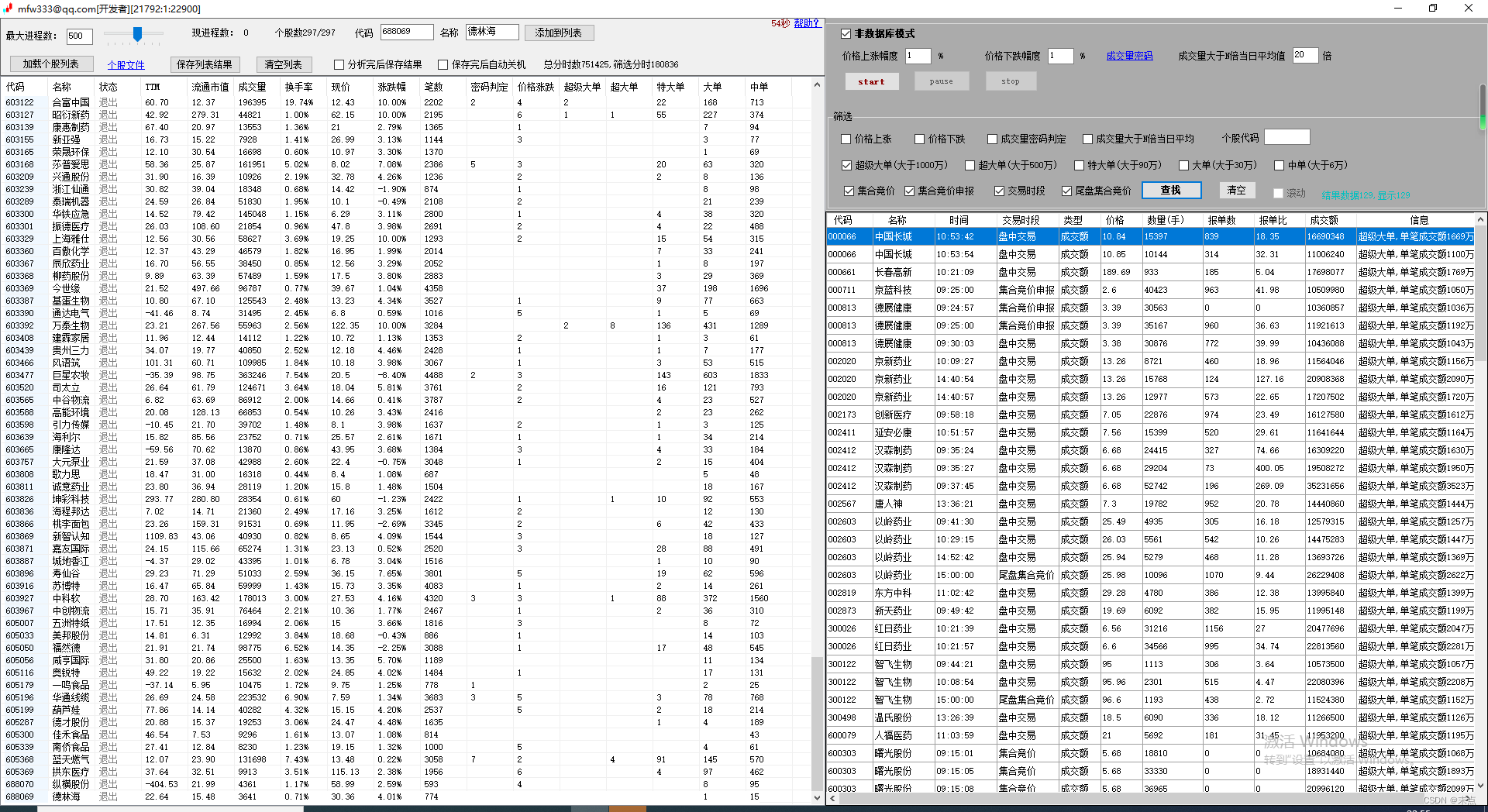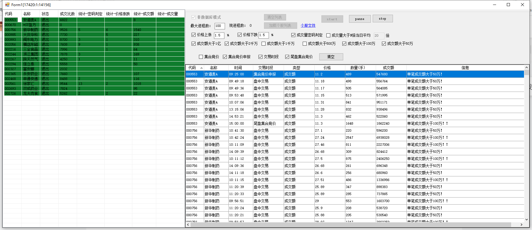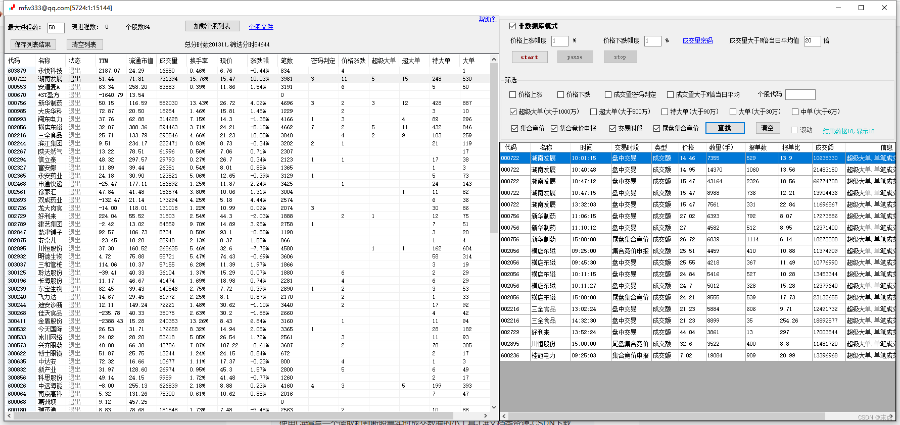 6.软件左侧列表为需要分析的个股数据,单击开始后,将对列表中的每只股票开启一个线程进行成交数据的读取和步骤2的分析判断,并将判断结果返回主进程显示到软件界面。同时左侧列表中个股后也会统计各项判断的数据量;双击股票代码,将使用系统默认浏览器打开同花顺个股页面