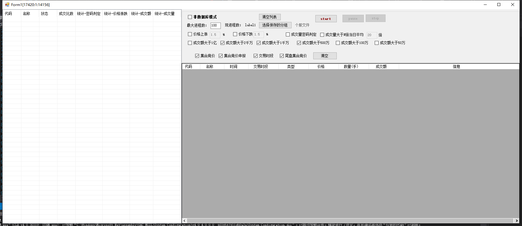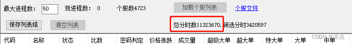 d.限定了同时运行的线程数为200,即,如果列表中个股数大于200,在盘中交易时段只能运行前200个线程;同时增加了线程的启动和停止功能,可以停止正在运行中的线程,也可以运行指定的未运行的线程排列到等待队列中,新线程开启时优先运行;