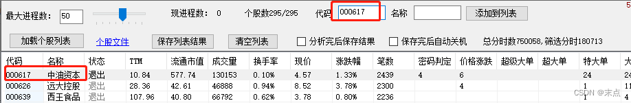 7.流程控制。可以设置同时进行分析的股票数,但最大不能超过200,设置过大会导致服务器拒绝连接的问题,同时也会导致电脑CUP沾满而卡顿(笔记本i7-6700设置大于100后,在交易时段cup占到了90%多)。