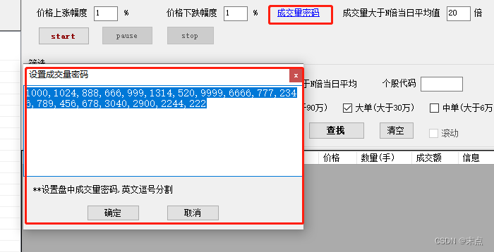 c:成交量是否匹配成交量密码数值,如1000, 1024, 888, 666, 999, 1314, 520, 9999, 6666, 777, 2346, 789, 456, 678,3040,2900...;
