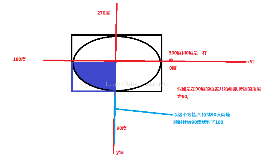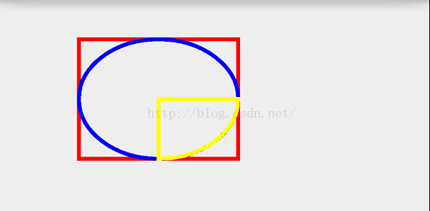 @Override protected void onDraw(Canvas canvas) { super.onDraw(canvas); mPaint.setColor(Color.RED); mPaint.setStrokeWidth(10); mPaint.setStyle(Paint.Style.STROKE); RectF rect = new RectF(100,100,500,400); canvas.drawRect(rect,mPaint); mPaint.setColor(Color.BLUE); canvas.drawOval(rect,mPaint); mPaint.setColor(Color.YELLOW); canvas.drawArc(rect,90,-90,true,mPaint); }效果: