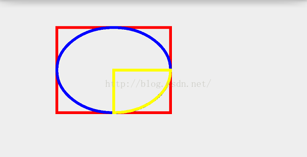 @Override protected void onDraw(Canvas canvas) { super.onDraw(canvas); mPaint.setColor(Color.RED); mPaint.setStrokeWidth(10); mPaint.setStyle(Paint.Style.STROKE); RectF rect = new RectF(100,100,500,400); canvas.drawRect(rect,mPaint); mPaint.setColor(Color.BLUE); canvas.drawOval(rect,mPaint); mPaint.setColor(Color.YELLOW); canvas.drawArc(rect,0,-90,true,mPaint); }效果: