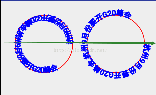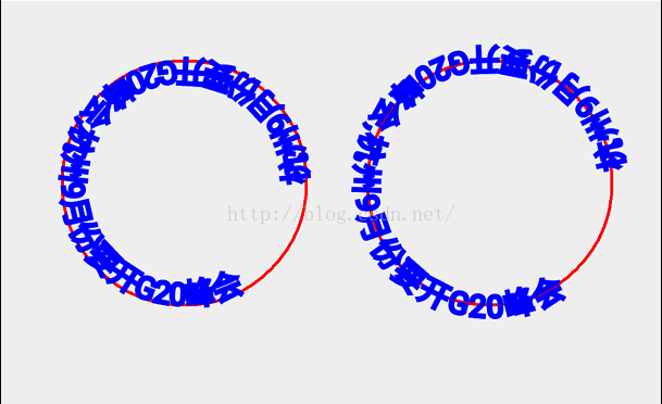 @Override protected void onDraw(Canvas canvas) { super.onDraw(canvas); mPaint.setColor(Color.RED); mPaint.setStrokeWidth(5); mPaint.setStyle(Paint.Style.STROKE); String text="杭州9月份要开G20峰会,杭州9月份要开G20峰会"; Path path = new Path(); Path path1 = new Path(); path.addCircle(300,300,200, Path.Direction.CCW); path1.addCircle(800,300,200, Path.Direction.CW); canvas.drawPath(path,mPaint); canvas.drawPath(path1,mPaint); mPaint.setTextSize(50);//设置字体 mPaint.setColor(Color.BLUE); mPaint.setAntiAlias(true); canvas.drawTextOnPath(text,path,0,0,mPaint); canvas.drawTextOnPath(text,path1,0,0,mPaint); }