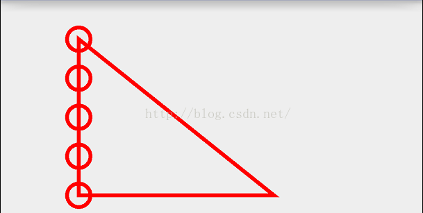 @Override protected void onDraw(Canvas canvas) { super.onDraw(canvas); mPaint.setColor(Color.RED); mPaint.setStrokeWidth(10); mPaint.setStyle(Paint.Style.STROKE); Path path = new Path(); path.moveTo(100,100); path.lineTo(100,500); path.lineTo(600,500); path.close(); path.addCircle(100,100,30, Path.Direction.CW); path.addCircle(100,200,30, Path.Direction.CW); path.addCircle(100,300,30, Path.Direction.CW); path.addCircle(100,400,30, Path.Direction.CW); path.addCircle(100,500,30, Path.Direction.CW); canvas.drawPath(path,mPaint); }效果: