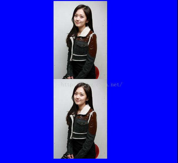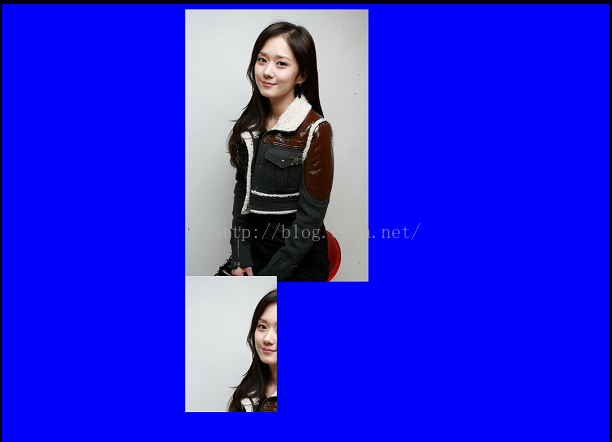 @Override protected void onDraw(Canvas canvas) { super.onDraw(canvas); Bitmap bitmap = BitmapFactory.decodeResource(getResources(), R.mipmap.meinv); canvas.drawColor(Color.BLUE); mPaint.setColor(Color.RED); //设置画笔颜色 mPaint.setStyle(Paint.Style.STROKE);//填充样式改为描边 mPaint.setStrokeWidth(5);//设置画笔宽度 canvas.drawBitmap(bitmap, bitmap.getWidth(),10,mPaint); canvas.clipRect(bitmap.getWidth(), bitmap.getHeight(), bitmap.getWidth()+bitmap.getWidth()/2 , bitmap.getHeight()+bitmap.getHeight()/2); canvas.drawBitmap(bitmap, bitmap.getWidth(), bitmap.getHeight(), mPaint); }效果: