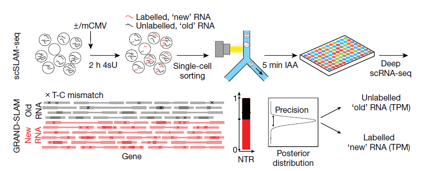 由于4sU掺入率约为在50-200个核苷酸中有1个,因此所有来源于新RNA的SLAM序列读段中,有高达50%可能不含铀转化成碳。为了克服这个问题,原文作者开发了“使用SLAM-seq技术对新转录的RNA和衰变率进行全局精确分析的方法(GRAND-SLAM)”,其为一种贝叶斯方法,以包括可信区间在内的完全量化的方式计算新RNA与总RNA的比率(new to total RNA,NTR)(图1)。原文作者还开发了GRAND-SLAM 2.0用于并行分析数百个来源于单个细胞的SLAM-seq文库。通过在成对端模式下分析长读段(150个核苷酸),进一步提高了定量的准确性,这使得4sU转化能够有效地与重叠序列中的测序误差区分开。从而获得了每个细胞数千个基因的精确测量值(90%可信区间< 0.2),从而接单细胞转录组测序scRNA-seq的总灵敏度,并与多细胞SLAM-seq 的数据高相关(相关系数R > 0.73)。