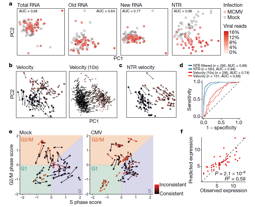 高度可变细胞基因的无偏主成分分析(PCA)结果显示,不能区分感染巨细胞病毒的细胞和未感染的细胞,无论是总RNA还是旧RNA,对新RNA只能有轻微的区分**(****图2a)。因此,细胞间异质性超过了病毒诱导的变化,这种变化在感染后两小时内很难在总RNA中检测到,这是因为哺乳动物RNA的周转缓慢。相比之下,NTR上的主成分分析可高精度从感染细胞中分离出未感染的细胞(****图2a)**,并显示出与病毒基因表达程度的明显正相关(皮尔逊相关系数R = 0.59,P-value= 7.3 × 10)。