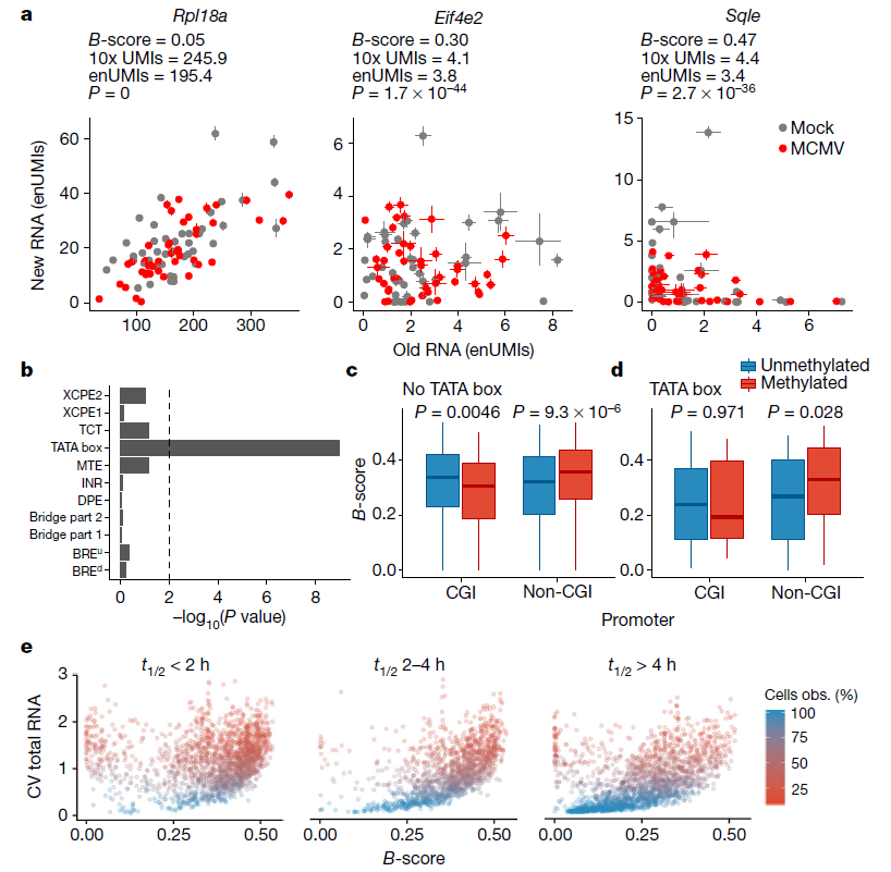 无偏基因本体(Gene Ontoloy)富集分析显示,高B分数的基因与蛋白质磷酸化和泛素化等功能类别相关。启动子分析确定了六个显著富集的低 (TATA box motif)或高 (富含CG和嘌呤motif) B-分数。Correctly placed TATA boxes富集的最明显(P-value< 10-8),与TATA box的启动子一致,在几分钟的时间尺度上频繁的转录爆发。没有观察到与其他核心启动子motif的关联(图4b)。富含CG的motif可以对应于显示振荡激活模式的特定转录因子的结合位点,或者反映相应启动子内富含CpG的区域。超过50%的哺乳动物转录起始于靠近CpG岛的启动子(CGI启动子),这些启动子代表几十到几百个核苷酸的富含CpG的区域。CpG岛的高甲基化是基因沉默的表观遗传控制机制。来自小鼠成纤维细胞的亚硫酸氢盐测序数据揭示了甲基化的降钙素基因相关肽启动子与低B-评分的显著相关性,而甲基化的非降钙素基因相关肽启动子倾向于显示高B-评分(图4c)。对于含有TATA box的启动子也观察到同样的情况(图4d)。通过重复对1718个具有显著B值的基因和前50%最强表达基因的分析,证实了这些结果。虽然不能完全排除这里所用细胞系的转录活性和核型复杂性的等位基因差异导致了一些观察到的效应,但这并不能解释B-评分与启动子内在特征的强烈相关性。原文作者提出了一个模型,其中基因启动子中的DNA甲基化通过在数小时内的时间尺度上暂时抑制基因的启动子而参与短暂的启动子活性调控。最后,B分数与观察到的单个细胞转录组的异质性高度相关(图4e)。因此,基因启动子特异性特征是细胞间异质性的主要原因。