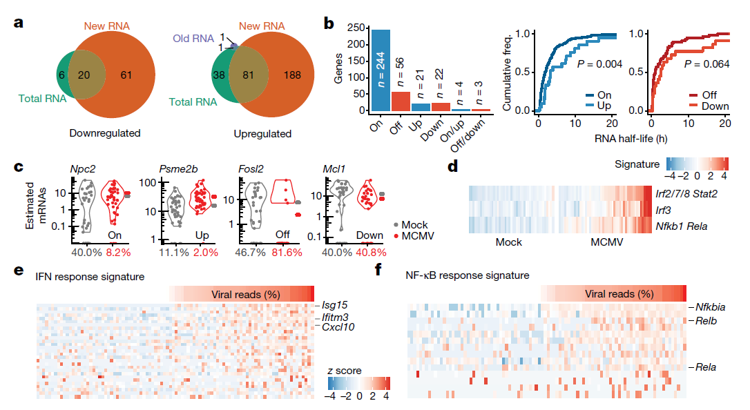 为了评估巨细胞病毒感染对细胞基因表达的影响,原文作者使用单细胞两相检测程序(SC2P)从总的、新的和旧的RNA中鉴定了巨细胞病毒感染和未感染的单细胞之间差异表达的基因。大多数下调(87个基因中的61个)和上调(309个基因中的188个)基因(超过60%)只有通过专门考虑新的RNA才能被发现(图3a)。基因表达的双峰性是单细胞中一个很好描述的特征。双峰性表达的基因在一个细胞亚群中检测不到表达,但可在其他细胞群中检测到表达。scSLAM-seq直接观察细胞中给定基因的启动子在研究的时间范围内是否“开启”。值得注意的是,原文作者发现大多数巨细胞病毒诱导的新RNA的变化更多地与开关动力学相一致,而不是与上调或下调相一致(图3b,c)。