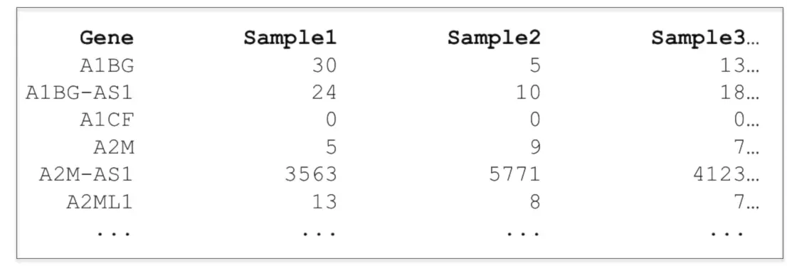每一行都是原始的统计值,每个基因在每个样本中被抓到多少次