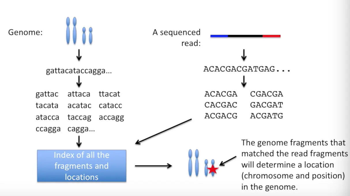先将大的基因组序列打断成许多小片段,然后为了方便接下来寻找这些片段,需要对他们进行构建索引index(目的就是标注每个小片段的位置)
