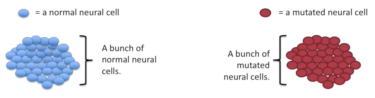 假设有一群正常的神经细胞(蓝色)和一群变异的神经细胞(红色)