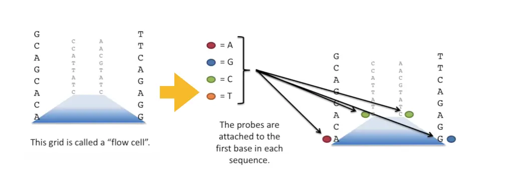 一块测序板上(想象下载玻片,其实人家真名是Flowcell)能包含多于400,000,000个片段,垂直于测序板排列。