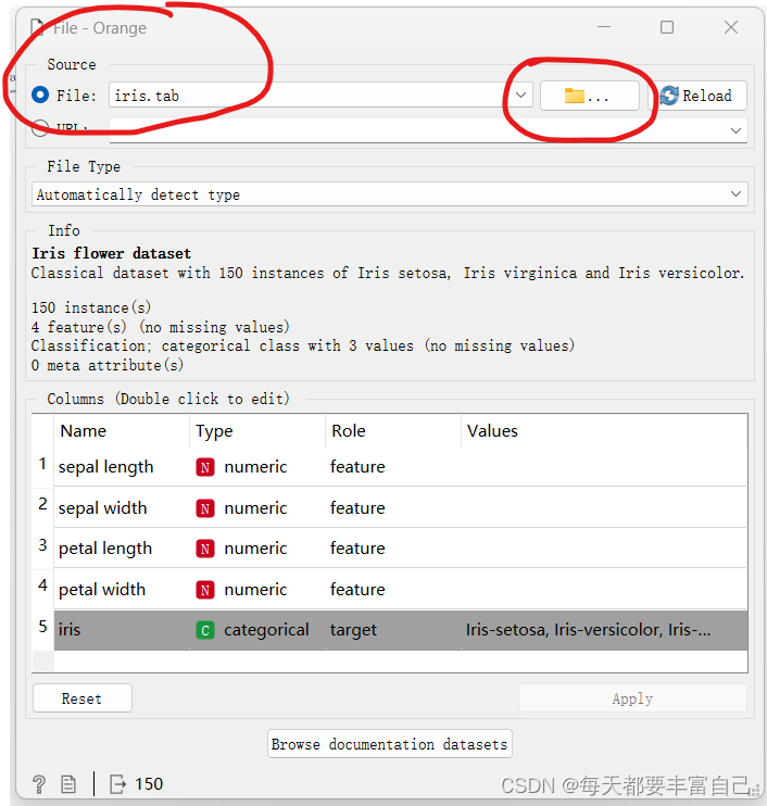 鸢尾花数据集是Orange所带的,可以直接load,如果是自己的数据,可以直接选择自己的文件即可