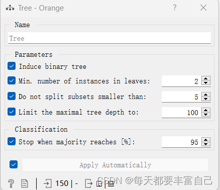 - Min. number of instances in leaves: if checked, the algorithm will never construct a split which would put less than the specified number of training examples into any of the branches. 一个叶节点要存在所需要的最小样本量。一个节点在分支后的每一个子节点中,必须包含至少 Min. number of instances in leaves 个训练样本,否则分支就不会发生。这个参数可能会使得模型更平滑,尤其是在Regression中