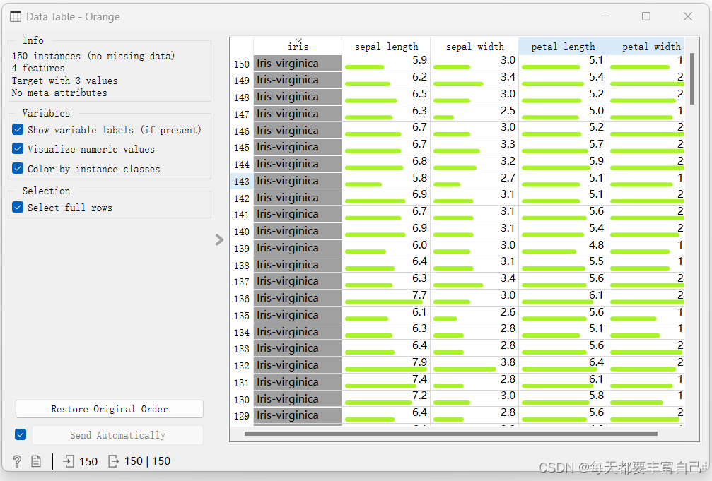 从上图可看出,Feature有四个,分别为sepal lengthsepal widthpetal lengthpetal witdth,它们的类型为numeric(数值型)target为iris,value分别为Iris-virginicavesicolorsetosa