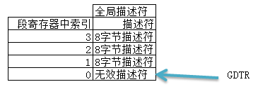 既然是索引,就像数组那样总该有个地址可以确定这个数组的首地址吧,在80386中有一个这样的寄存器GDTR里面由软件写入地址,这个地址里存放的便是全局描述符表的首地址,然后利用[首地址+8*索引值]就可以算出最终所要找到的全局描述符表中的一项,即 段选择子指向的描述符地址= GDTR里存的地址 +8×索引
