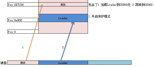 执行流程 BIOS[CS:IP 0XFFF0:FFF0]--》CS:IP[0:0X7C00]----(MBR将loader加载到0X900)--->CS:IP[0:0X900]---(loader中)