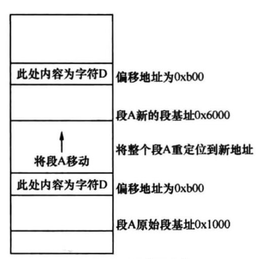 于是,分段机制就产生了。让CPU通过 段基址:段内偏移 来访问任意内存,这样程序就可以实现重定位。也就是说,段内偏移相对于段基址是不变的。无论段基址是多少,只要给出段内偏移,CPU就能访问到正确的指令。于是加载用户程序时,只要将整个段的内容复制到新的位置,再将段基址寄存器中的地址改为该地址,程序便可准确无误的运行,因为程序中用的是偏移地址,相对于新的段基址,该偏移地址处的内容还是一样的,如图所示: