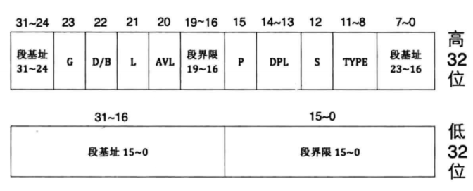 一个段描述符表中,会存放很多的段描述符数据,每一个段描述符为8字节,它的格式如下图所示