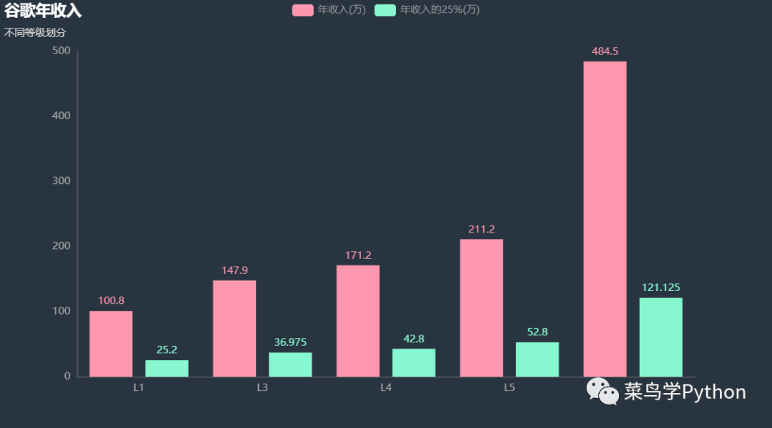 为了更好的进行收入的展示,我们分别选取五个不同等级的员工收入情况,进行可视化的展示,如下图所示: